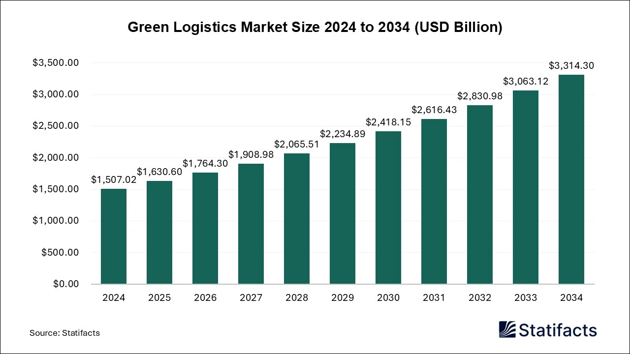 Ottawa, Oct. 16, 2025 (GLOBE NEWSWIRE) -- According to Statifacts, the global green logistics market size reached USD 1,507.02 billion in 2024 and is estimated to attain USD 3,314.3 billion by 2034, growing at a CAGR of 8.2% during the forecast period from 2025 to 2034. Operational cost savings, improved CSR objectives, innovation in green technologies, rising demand for sustainability, and stricter environmental regulations are driving the growth of the market.